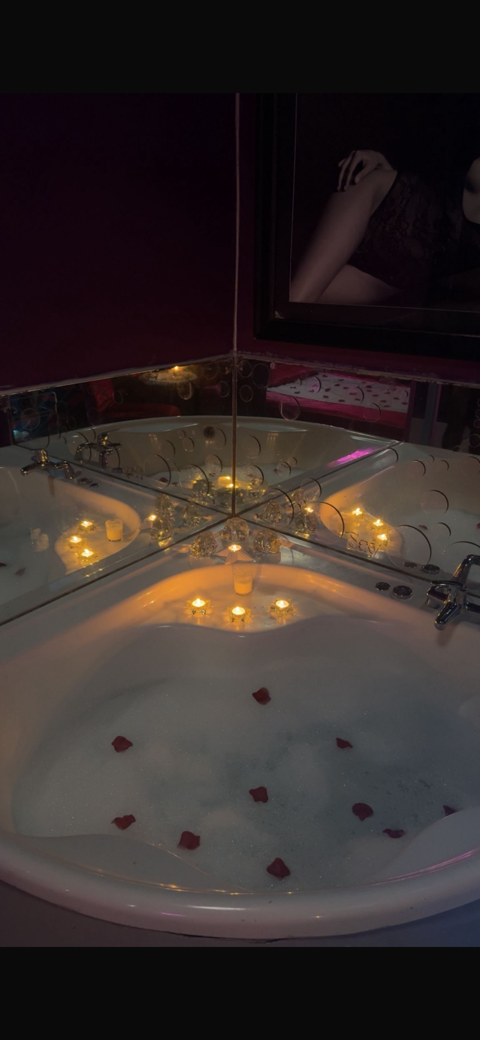 What more could you want than a relaxing bubbly bath by candle light rose petals scattered along the floor